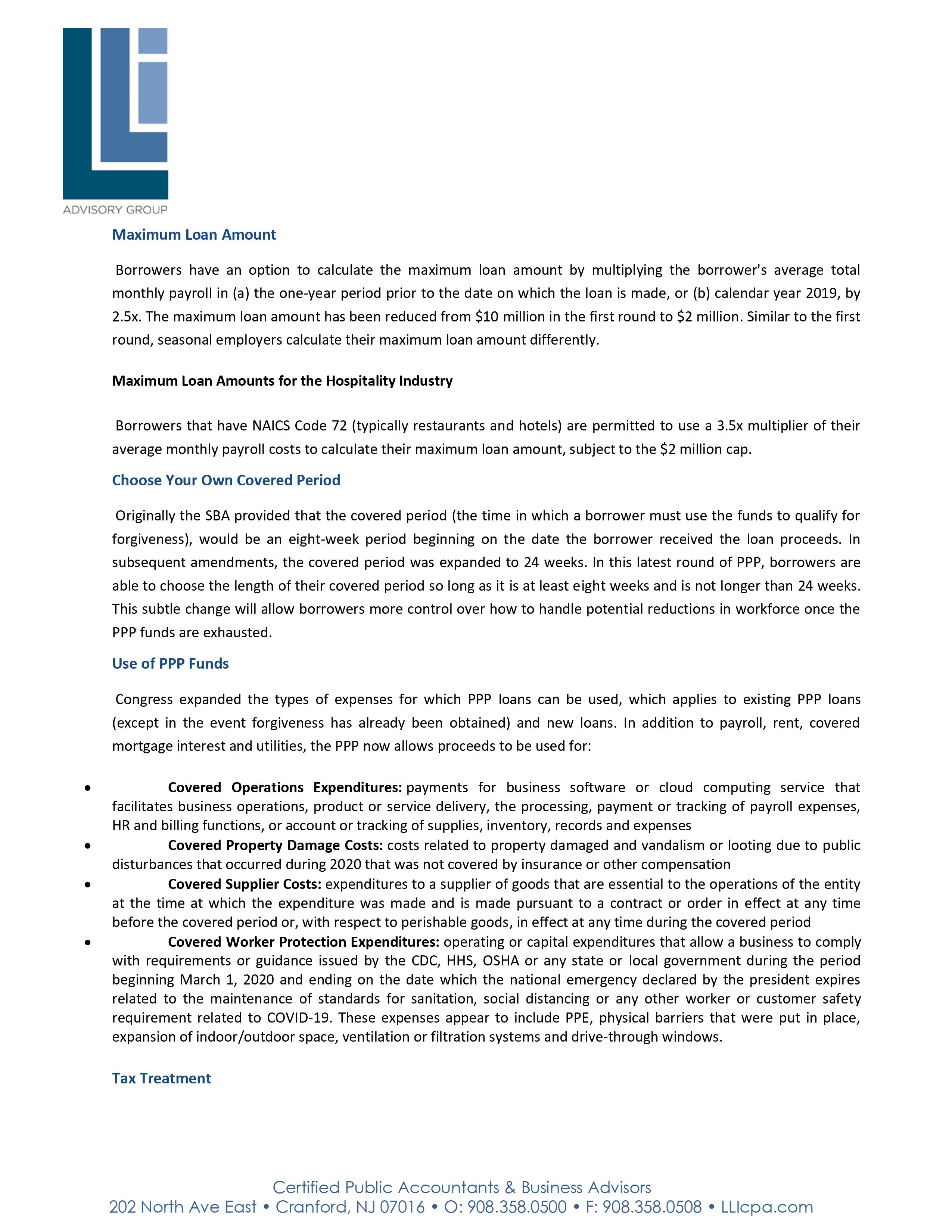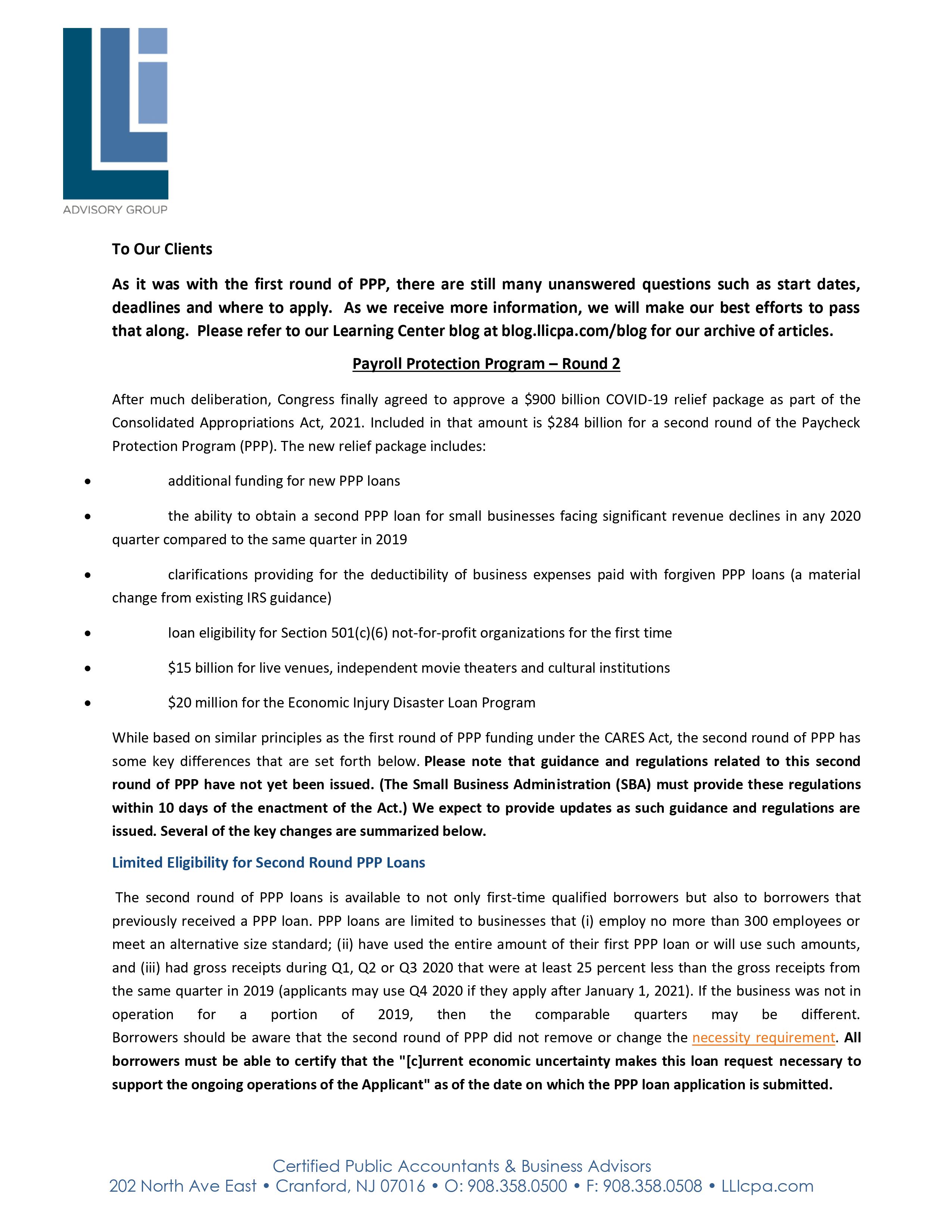 After much deliberation, Congress finally agreed to approve a $900 billion COVID-19 relief package as part of the Consolidated Appropriations Act, 2021. Included in that amount is $284 billion for a second round of the Paycheck Protection Program (PPP). The new relief package includes: